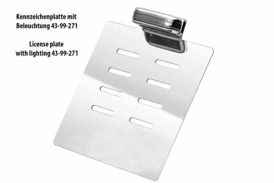 Universell passend für viele Modelle. Zur Kombination mit unseren Kennzeichenhaltern VA. Bitte Nummernschildbeleuchtung #43-99-271 / 275 separat bestellen.