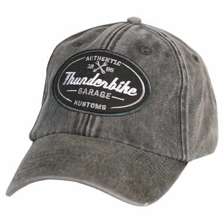 Die brandneue Thunderbike Baseball Cap im Vintage Design mit „Authentic Garage“ Patch ist hinten verstellbar.